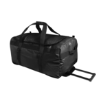 Large-volume, duffel bag with ample storage room, heavy-duty, reinforced webbing and handles, roller wheels and extendable pull handle for easy transportation.